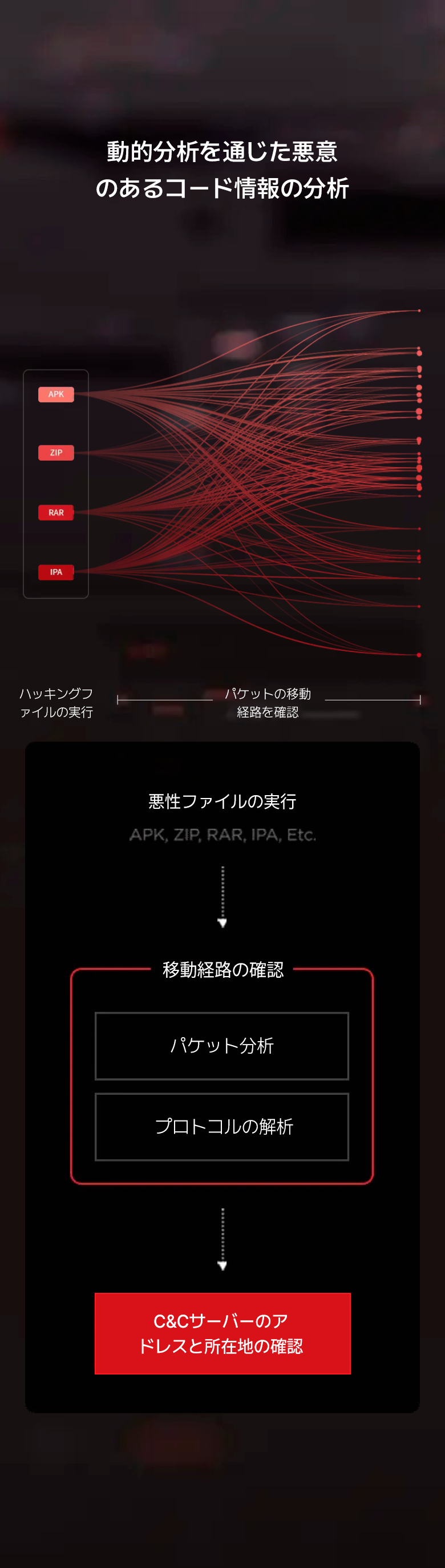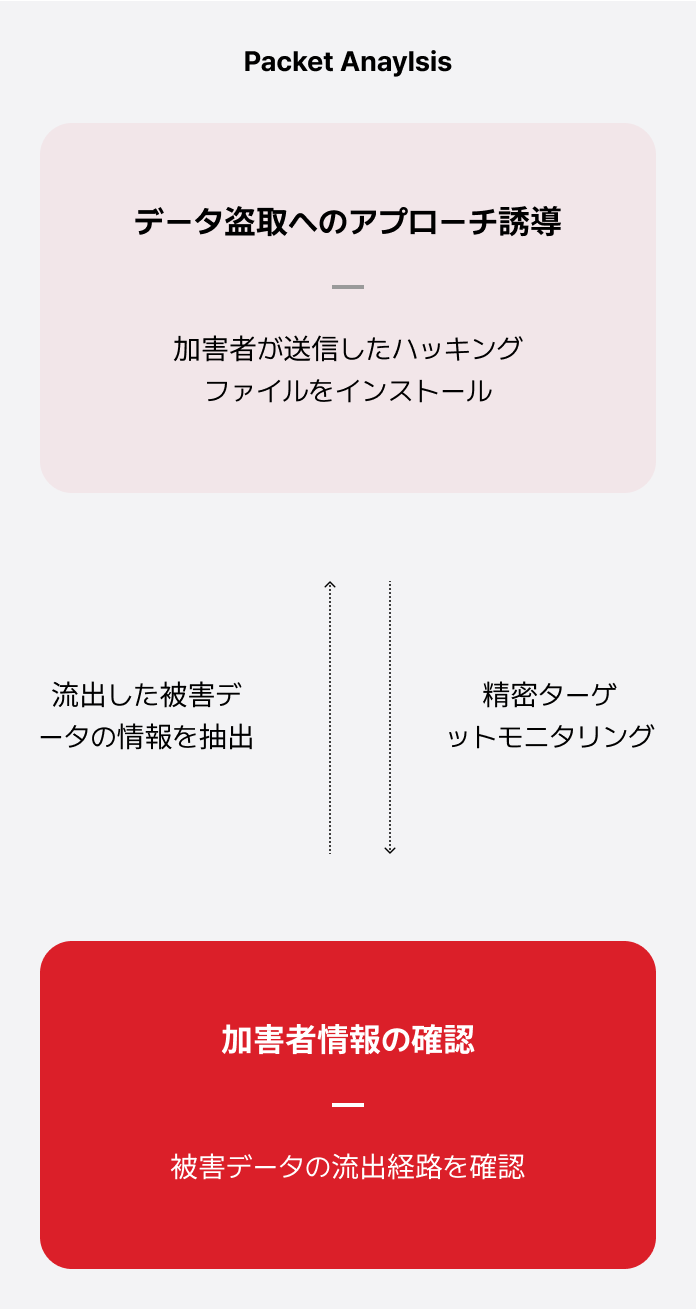 悪意のあるコード実行時に発生する情報を通じて、加害者の情報やデータ流出経路を確認します。