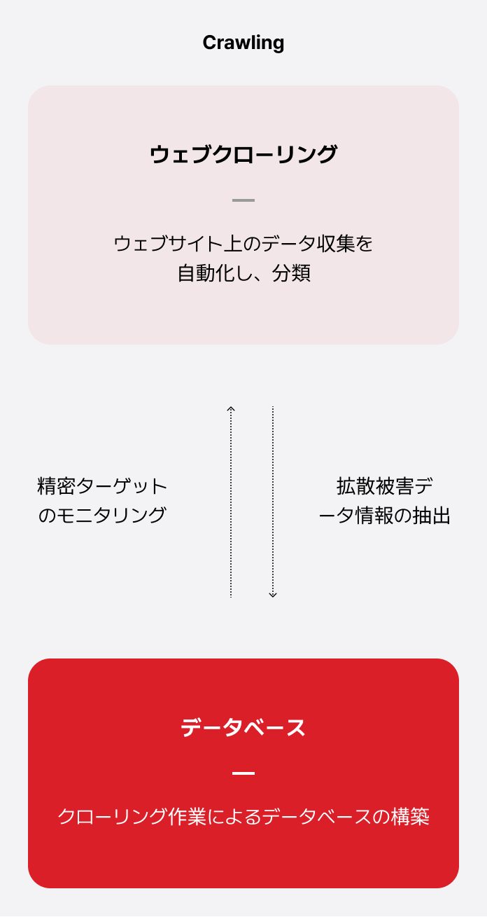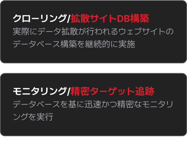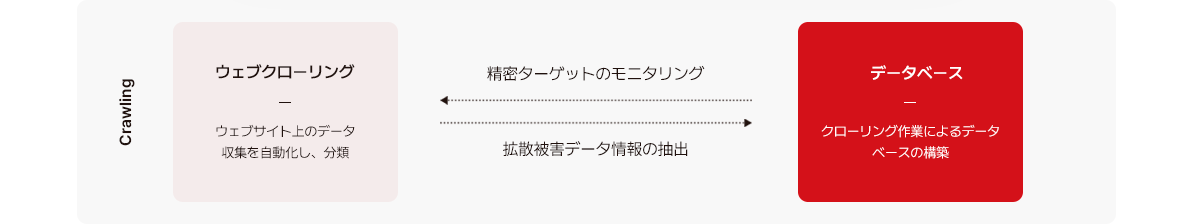 ウェブ上に存在する被害データを検出する技術で、被害データから抽出した値を活用し、拡散の可能性があるページを自動で分析して拡散の有無を確認します。