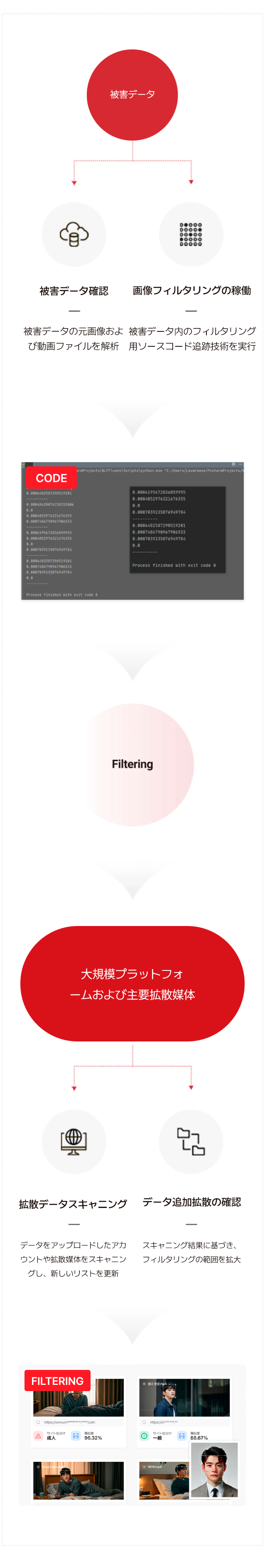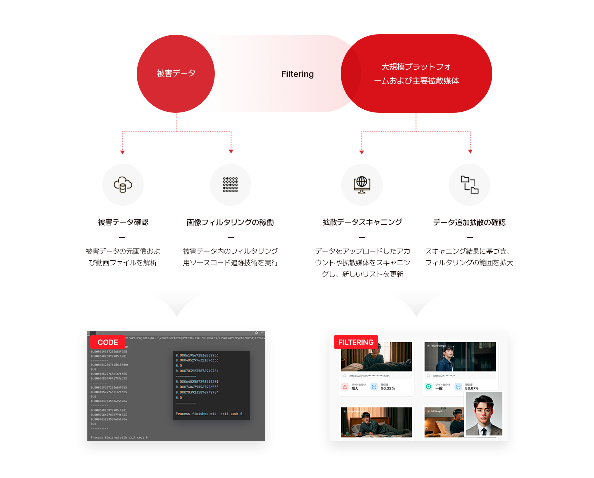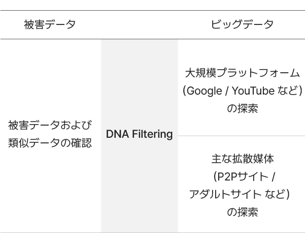 被害データの拡散防止に使用される技術で、被害元データおよび類似データを基に、ウェブ上で同一データの拡散有無を確認し、一部改変されたデータまで探索可能なAI技術です。