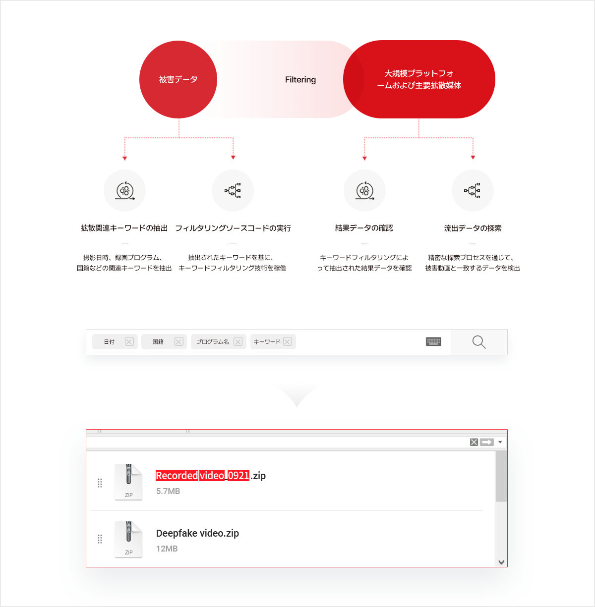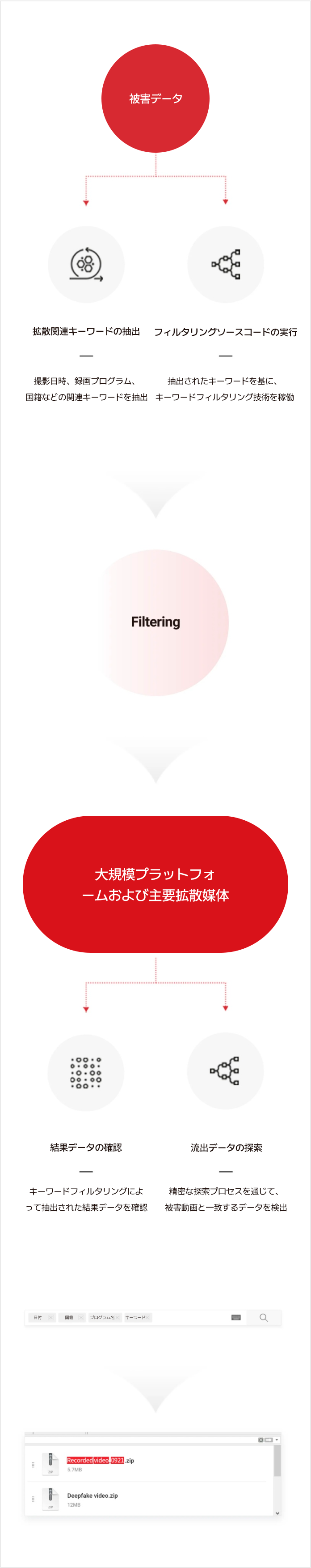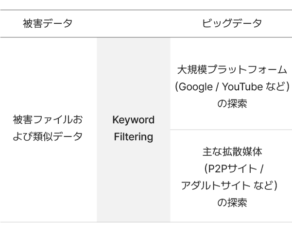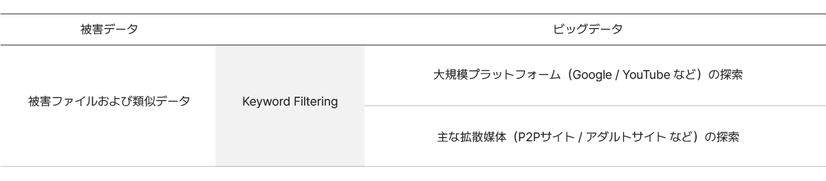 ウェブ上での被害データ拡散防止を目的としたモニタリング技術で、被害データに関連するキーワードを抽出し、画像認識が不可能な領域まで同一被害データの存在を確認できるAI技術です。